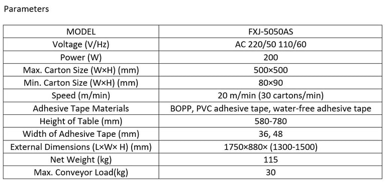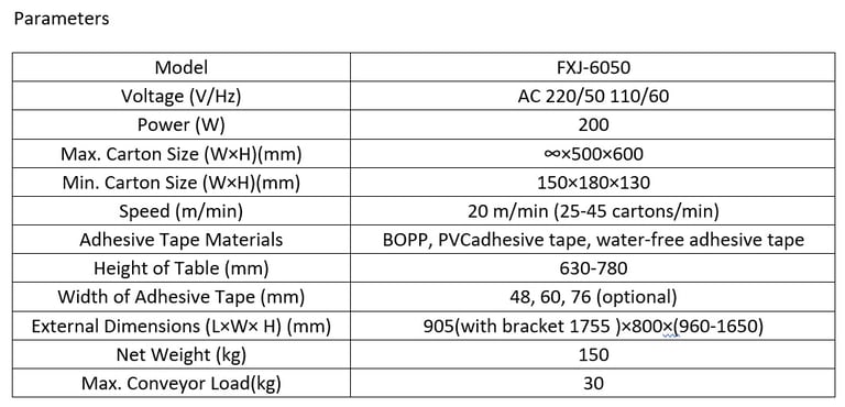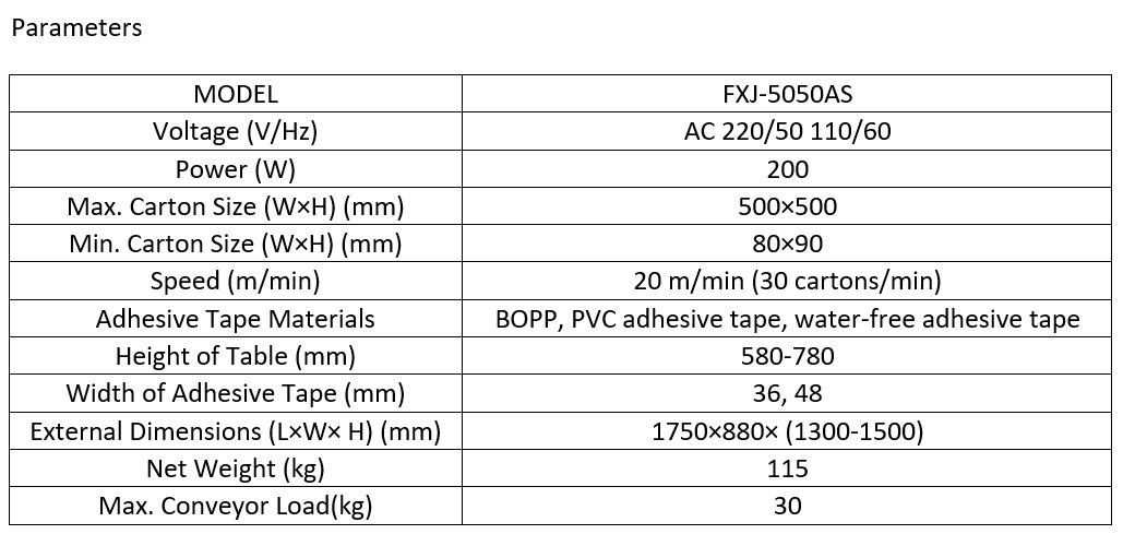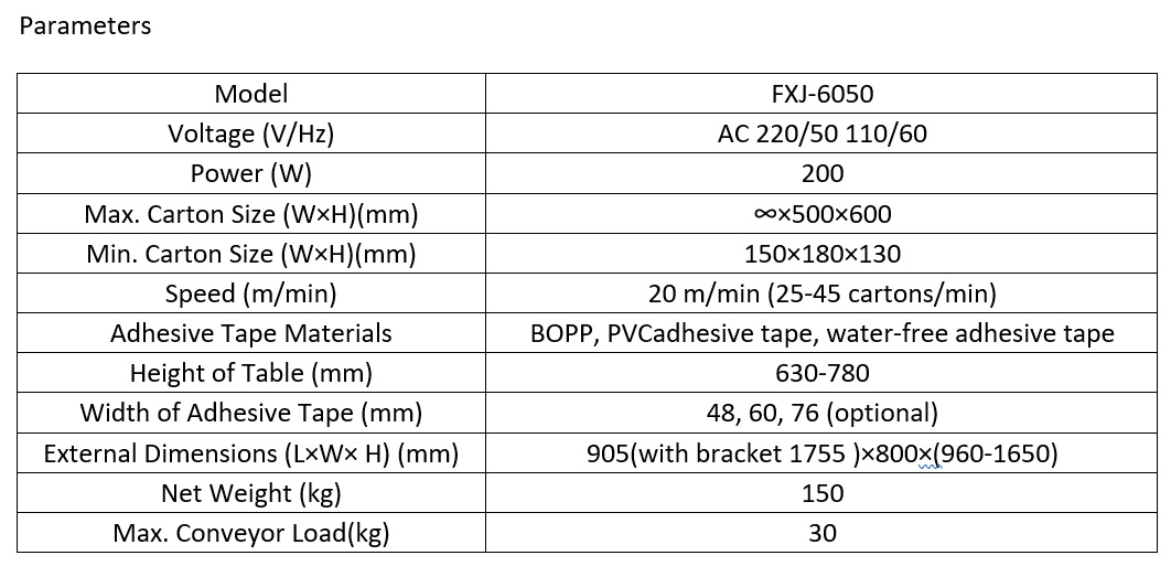 Model FXJ-6050: top and bottom drive belts, used in circumstance where cartons size is not changed frequently, especially ideal for sealing uniform and high cartons